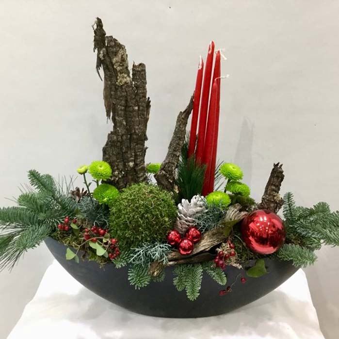 Εντυπωσιακή σύνθεση σε οβάλ βάση με διάφορα άνθη και χριστουγεννιάτικα διακοσμητικά.