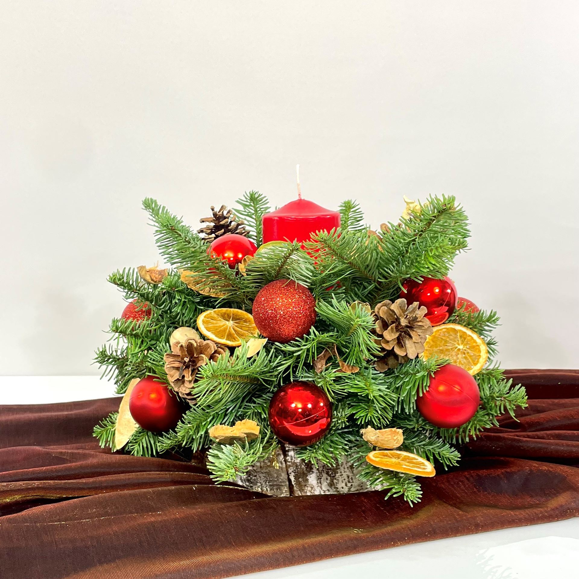 A beautiful wreath with dried fruits and a candle in the center, bringing warmth and a festive atmosphere to your table.