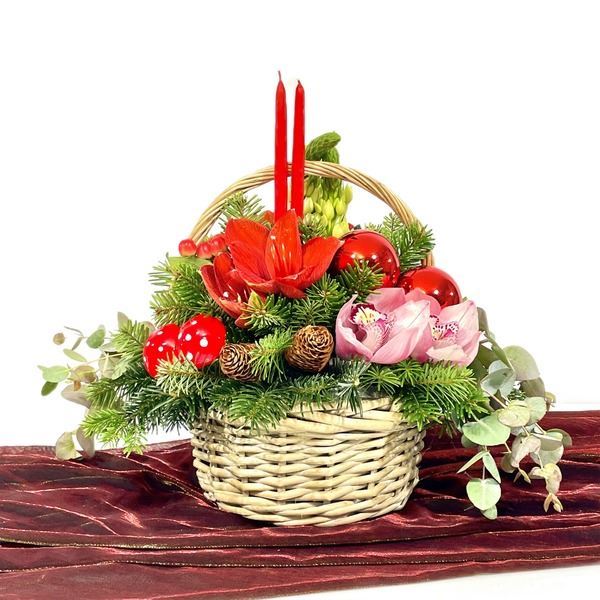 A beautiful flower arrangement in a basket, carrying wishes and festive ambiance for the holidays. Height: ≈30cm Length: ≈40cm