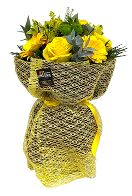 Bouquet with yellow roses, gerberas, chrysanthemum, asltromerias and foliage.