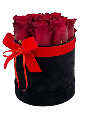 Μαύρο βελούδινο κουτί με φρέσκα μεγάλα κατακόκκινα τριαντάφυλλα. Διάμετρος κουτιού : 15εκ.